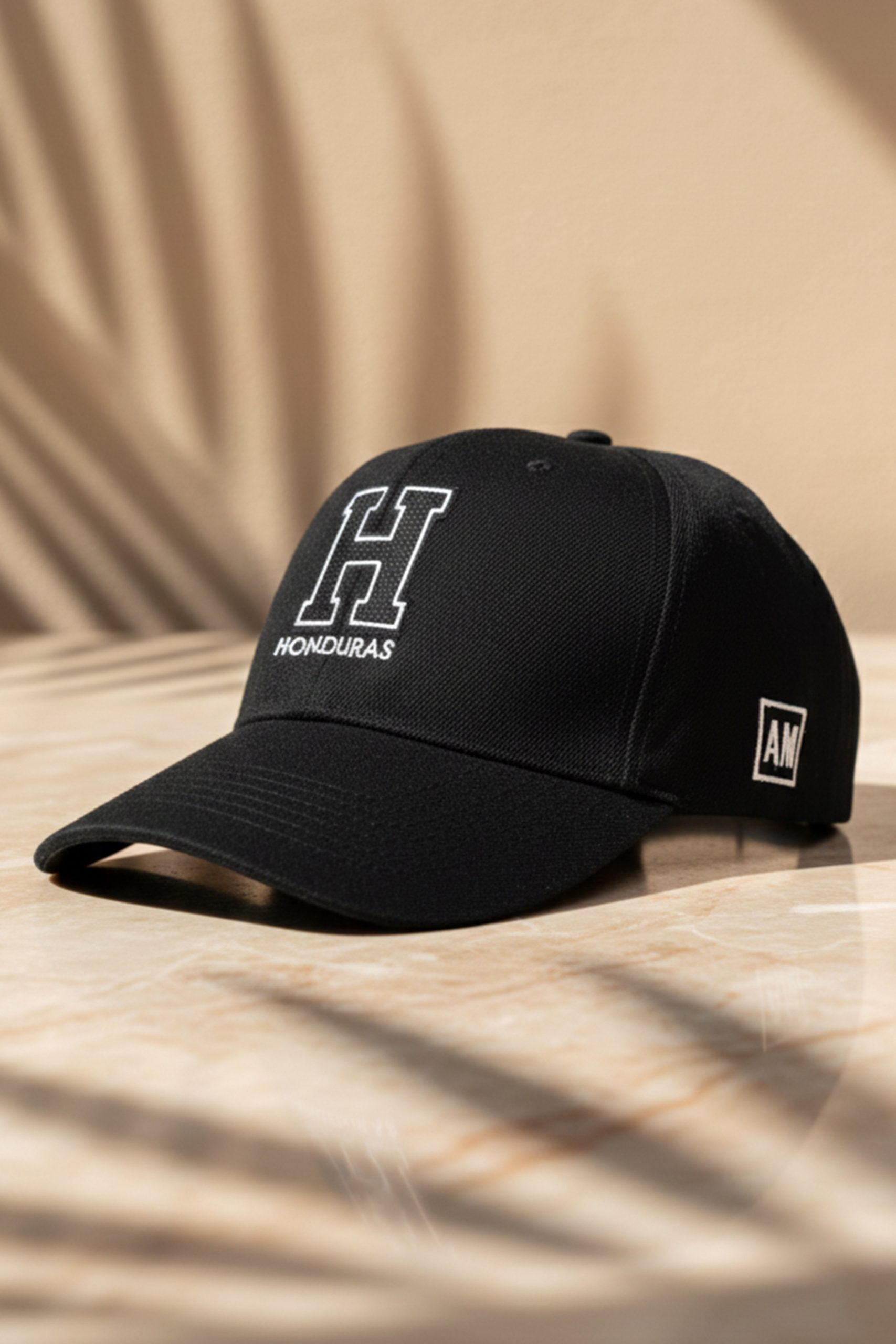 DESCRIPCIÓN: Gorra negra ajustable con faja de velcro. Unitalla. Bordado frontal y lateral con tacto.